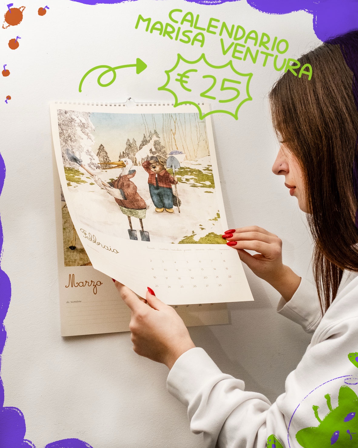 Marisa Ventura ci accompagna per i 12 mesi del 2026, raccontando con le sue illustrazioni fiabescehe la lunga storia della sua nuova casa, costruita e pensata insieme suo compagno di sempre: Lollo Testa di Legno.