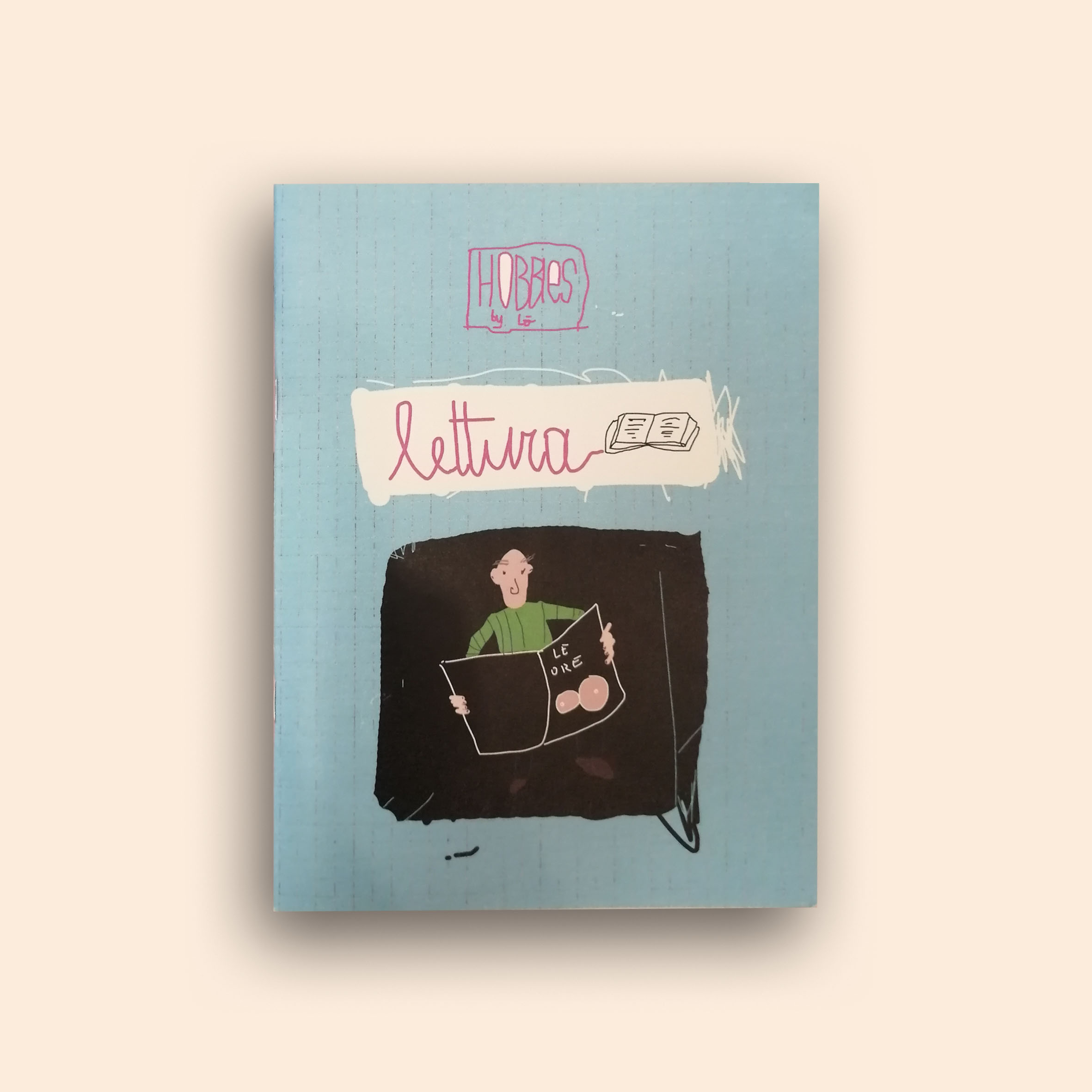 Un quaderno dal colore azzurro cielo, con una simpatica illustrazione dedicata all’hobby della lettura sulla copertina.
