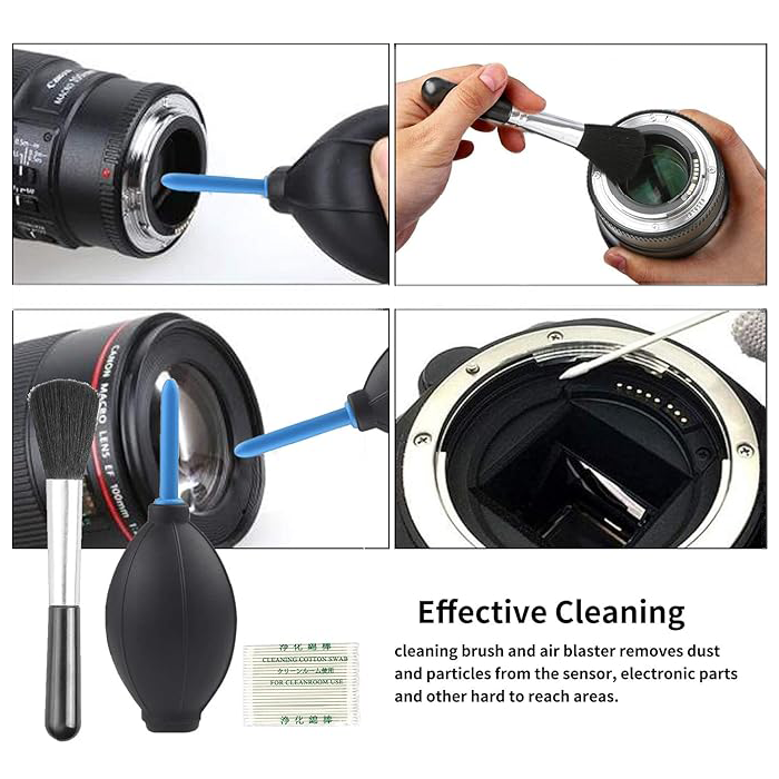 - 【Kit di pulizia professionale della macchina fotografica】: 1 x 30ml soluzione detergente per lenti, 1 x soffiatore d’aria, 1 x penna a doppia faccia per la pulizia delle lenti, 1 x pennello di pulizia, 1 x panno di pulizia in microfibra (9in * 9in), 1 x panno di pulizia in microfibra (6in * 6in), 5 x tamponi di spugna di depurazione, 4 x 16mm tamponi di pulizia del sensore, 1 x 24mm tamponi di pulizia del sensore, 1 x KuuuZuse borsa per il trasporto.